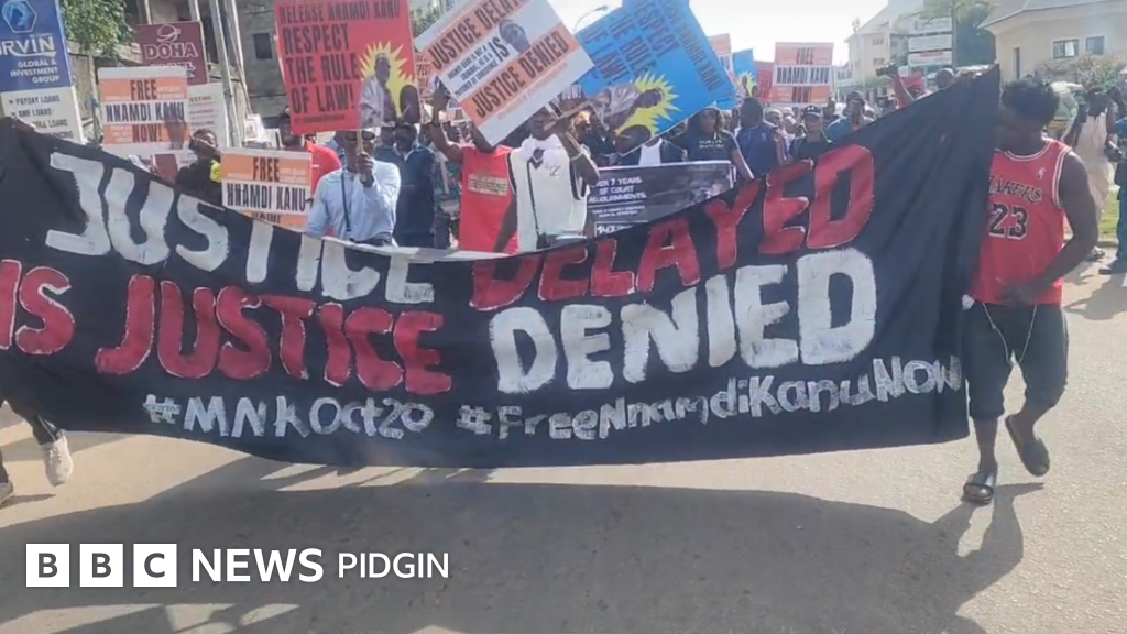On Monday morning, Omoyele Sowore and oda protesters march to di Nigeria Federal Capital Territory to demand for di release of Nnamdi Kanu, di leader of di Indigenous People of Biafra, Ipob, wey dey face treason and oda charges.