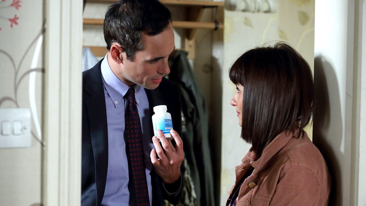 Michael is pleased with himself when he manages to intercept the pills from the courier before they are delivered to Janine. However, upon opening the package he realises he’s got the wrong one and persuades Alice to retrieve the pills from Janine’s house. Alice manages to get the pills just before Janine arrives home, pleasing Michael.