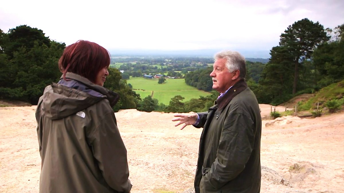 Food programme exploring specialities from around Britain. Brian Turner and Janet Street-Porter start their tour of Cheshire overlooking the countryside from Alderley Edge.