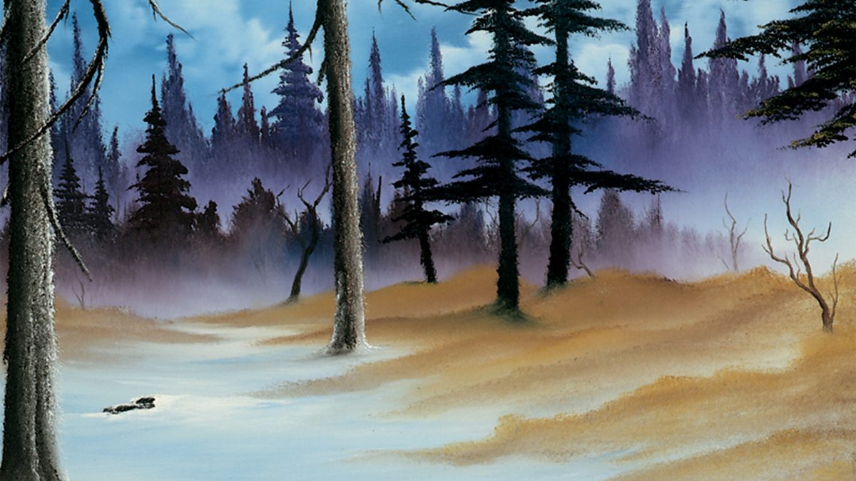 Follow Bob Ross along a trail covered in fresh white snow, surrounded by warm colours and fuzzy bark trees, as he paints a brisk quiet day.
