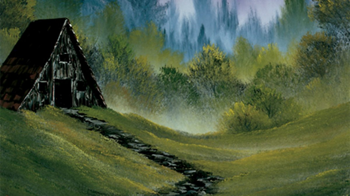 American painter Bob Ross unveils a secret little loft, hidden in the woods, surrounded by evergreens and ruffled green bushes and grass.