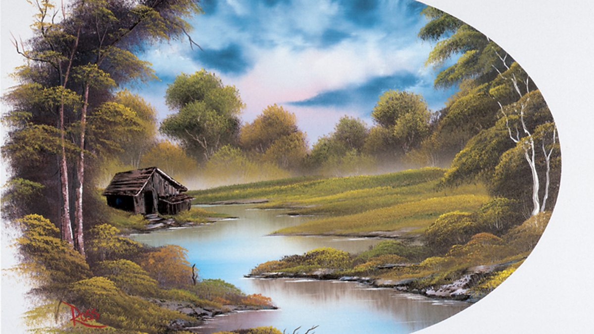 A cabin finds a peaceful resting place in a warm setting of lush, lakeside greenery in this wonderful oval-shaped painting by Bob Ross.