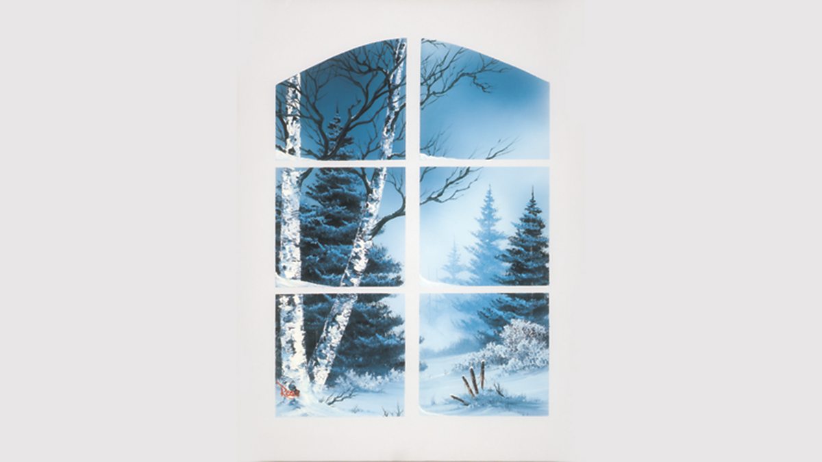A cleverly constructed shape on canvas! Peek through the windowpane and share a beautiful snowy day outside with artist Bob Ross.
