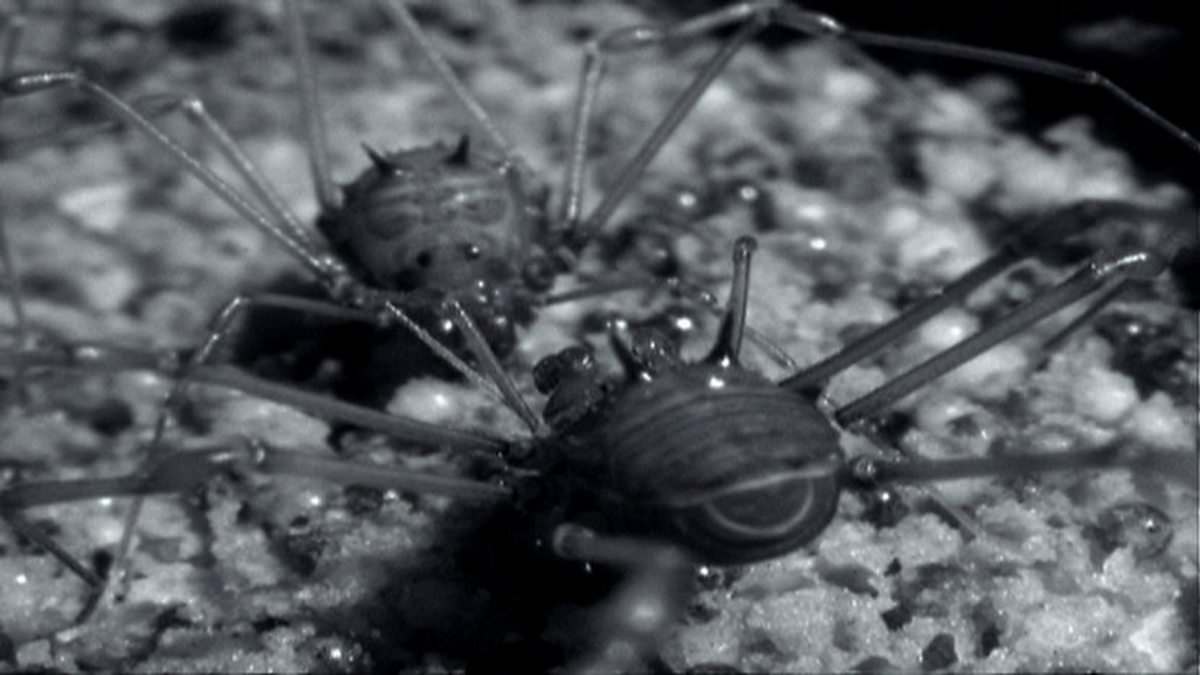 Male harvestmen are responsible for looking after the eggs. One dutifully cleans and guards his mud nest with its hundreds of eggs. Another male tries to steal the nest - they fight and the intruder is driven away. A female arrives and inspects the male's nest. Courtship, mating and egg laying takes place. But the next female is not here to lay eggs. She pretends to inspect the nest and mates, but then she tries to eat one of the earlier female's eggs. The male bites her legs until she runs away and he reburies the egg. A month later the babies hatch.