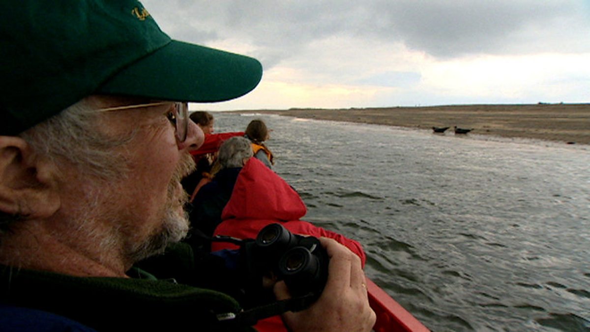 A boat trip is a leisurely way for Bill Oddie to get to Blakeney Point. Birds are not his main objective, but he's happy to see some brent geese. They've spent the winter in Britain and are due to head off to the Arctic Circle now. But they are late leaving, which suggests that they know that it is a late spring and will be still frozen up on the tundra. The main attraction of the trip is to see seals on the mudflats. There are two species here - common seals and Atlantic grey seals. Unfortunately both are greyish so are hard to tell apart. The grey seals have a more haughty look to them, while the common seals have a sweeter face. The big bull Atlantic seal is the biggest British mammal at twice the weight of a red deer.