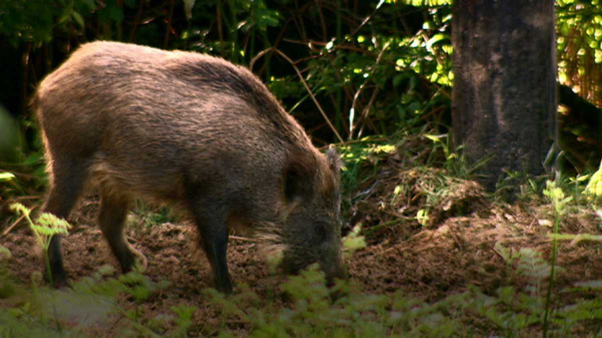 Bill Oddie goes wild boar watching, waiting for them to appear at about at about 6pm at this time of the year. Bill has brought a telescope because it’s quite a long way down to where they forage. On the other hand if a great big male came out with those whacking great tusks, it's good to be at a safe distance as they can’t half shift. Here’s a big female just come in. I think that is Dusty. This isn’t normal colour. Most wild boar are usually greyer than this. Oh and here’s another one that’s more near the normal colour. Another female. Dusty on the left because she is blonde and she looks as though she’s wearing too much mascara, big dark patches round the eyes, hence Dusty Springfield. We’ve now got three piglets. You can see there on the piglet, the stripes - those lovely tramlines down the side. Wild boars used to be pretty common in Britain, years and years ago, all the old banquets of the Middle Ages would have wild boar on the table. They used to go out hunting wild boar all the time and sadly that was what caused their demise, because apart from forests being cleared, they were really hunted to extinction by the 17th century. Nevertheless, unlike quite a lot of animals in this country they are quintessentially British, so Bill reckons they belong here.