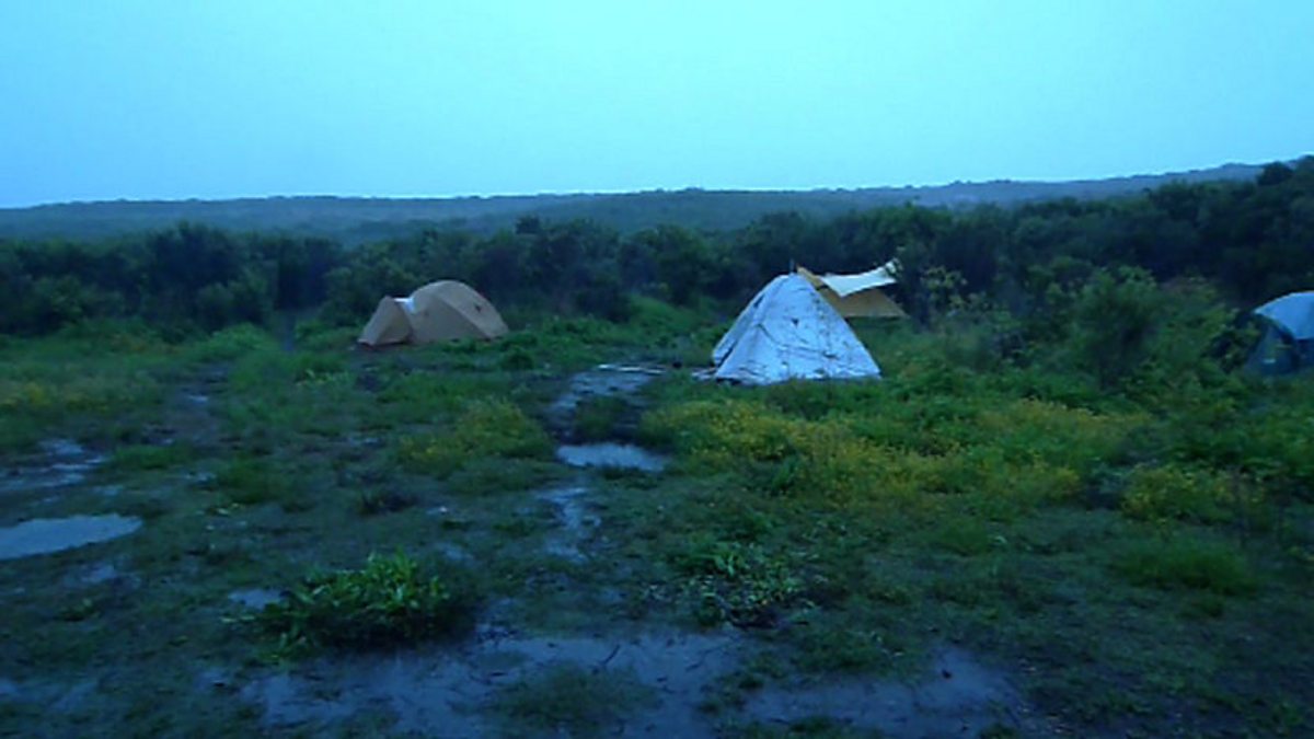 Before the full force of the cyclone hits the crew camp, cameraman John Brown records a clip to show his children back in England.