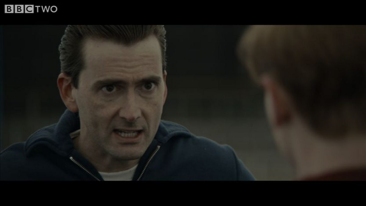 Jimmy Murphy (David Tennant) shows Bobby Charlton (Jack O'Connell) around Old Trafford and gives him a pep-talk about his future with Manchester United.