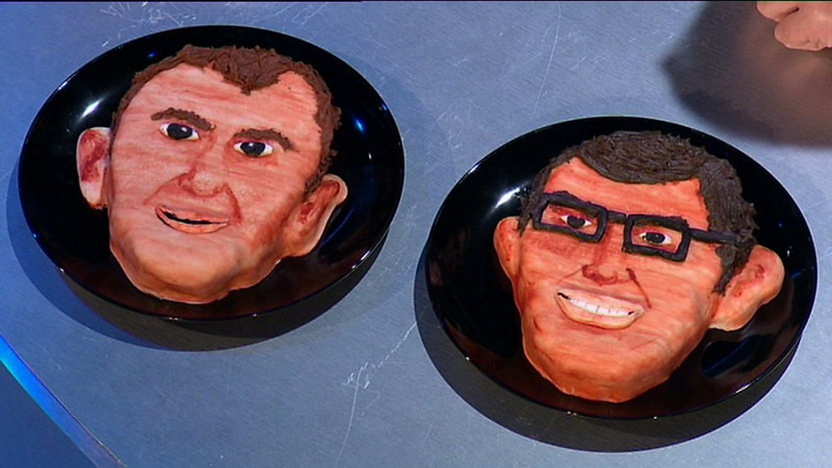 Contestants, Hannah & Jess, showcase their baking skills by making two cakes in the shape of Alexander and Richard's heads. Richard and Alexander joke about eating Alexander's ear.