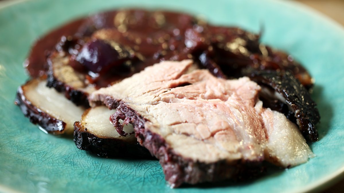Slow cooked, tender pork shoulder and crisp crackling served with a fruity stock.