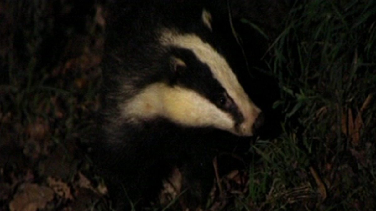 Iolo Williams and a badger expert observe badgers coming out of their sett at night in the Welsh countryside to find food. Includes close-ups of the boar and the sow.