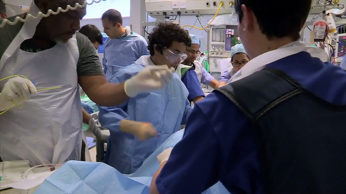 Doctors perform an innovative new procedure called REBOA on critically injured motorcyclist Michael. The aim is to block the aorta with a balloon to stop him bleeding to death.