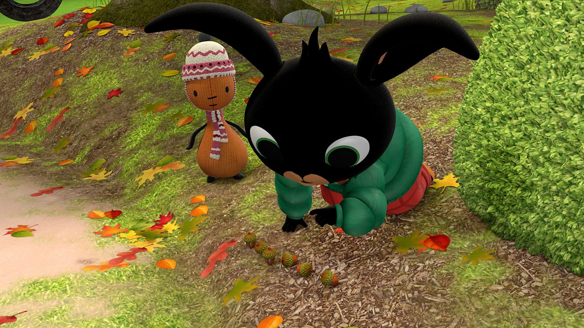 Mae'n ddiwrnod hyfryd yn yr hydref ac mae Bing a Swla yn y parc gyda Fflop yn casglu mes. It's a beautiful autumn day and Bing and Swla are in the park with Fflop collecting acorns.