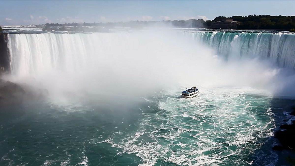 Michael experiences a dramatic boat ride as he soaks up the powerful spray of Niagra Falls.