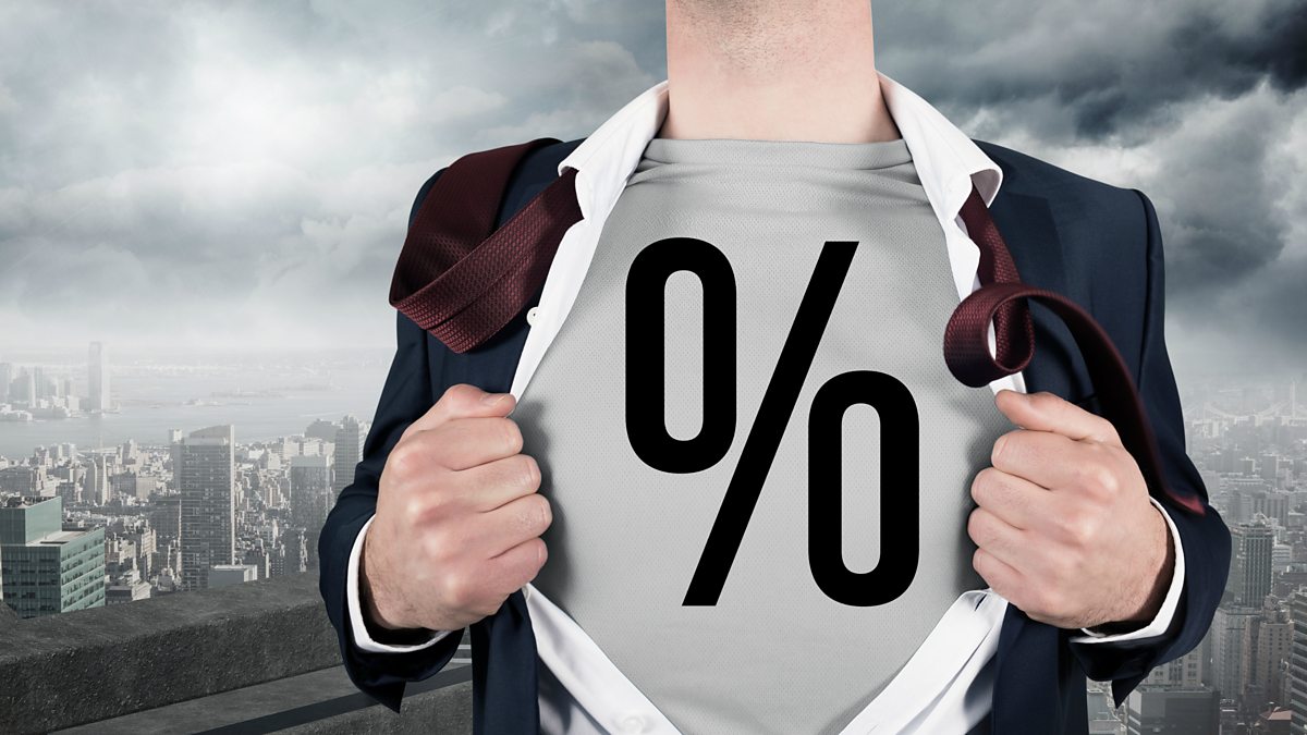 (Photo: Computer graphic of a man opening his shirt revealing a t-shirt with percent symbol. Credit: Wavebreakmedia Ltd)