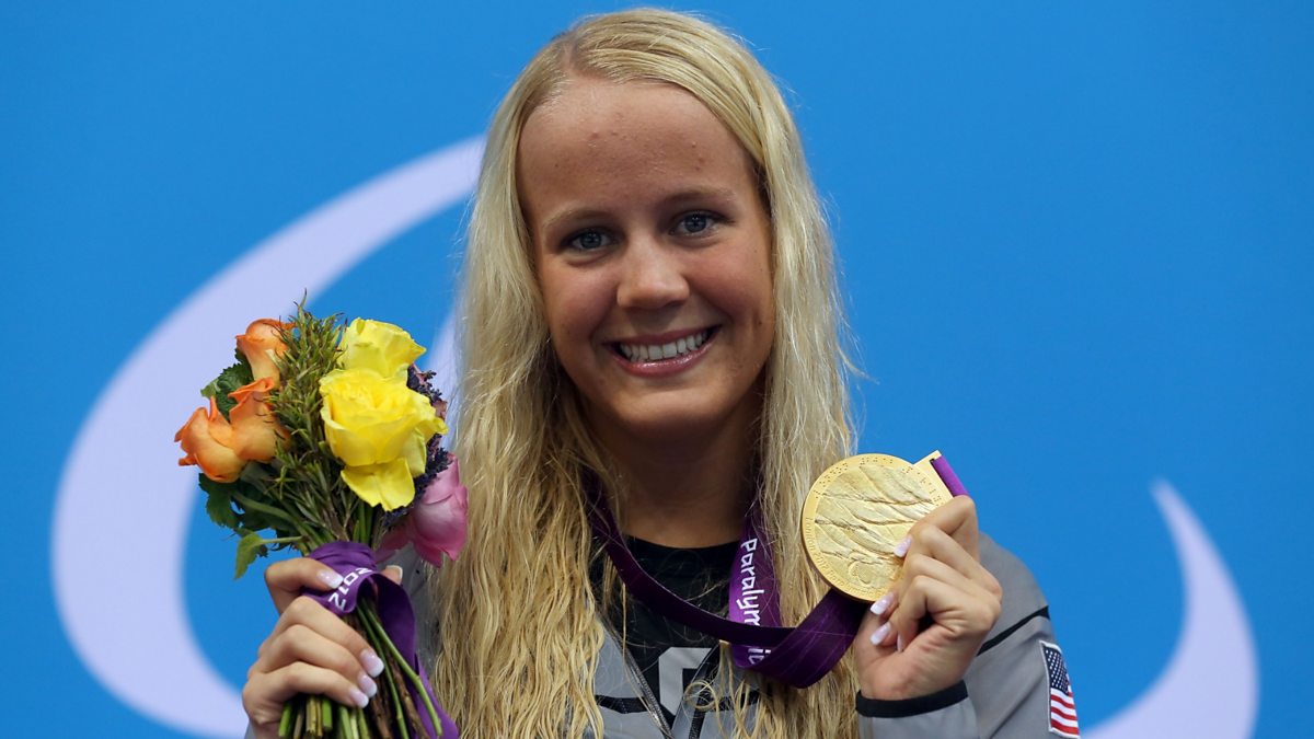 Picture: Mallory Weggemann of the USA after winning the gold medal in the Women's 50 metre Butterfly S7 Final in London 2012. (Image:Getty Images)