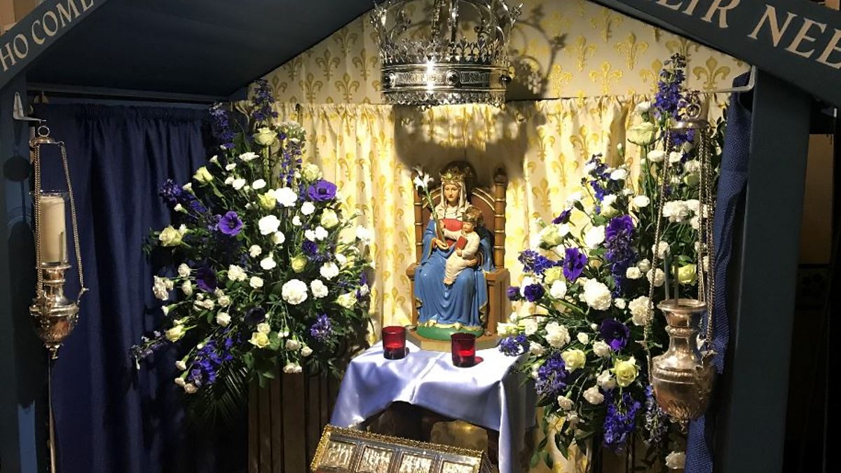 Lancaster Cathedral's Fr. Stephen Pearson welcomes Walsingham's Slipper Chapel statue.