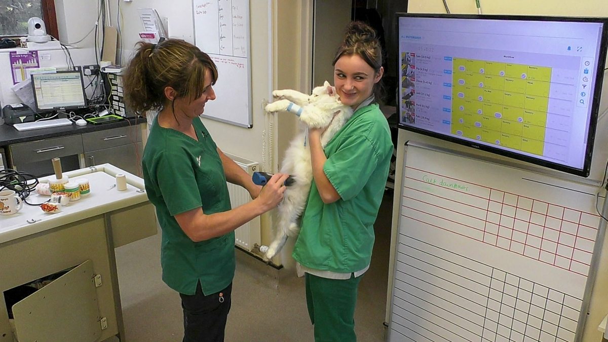 Y tro hwn, mae un o brif bartneriaid y practis yn helpu rhoi genedigaeth i wyn bach ac mae'r theatr yn brysur gyda llawdriniaethau i Pabi'r ci a Bella'r gwningen. A busy day for the vets!