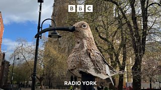 Matt Trevelyan, dressed as Cathy the 10-foot curlew, speaks to Georgey Spanswick.