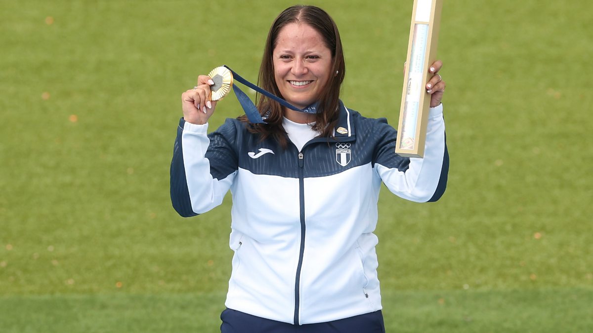 Ruano Olivia won gold in the Olympic women's trap shooting final, setting a new Games record of 45 out of 50 hits.