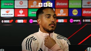 Villa full-back Matty Cash at their pre-match press conference in Bologna.
