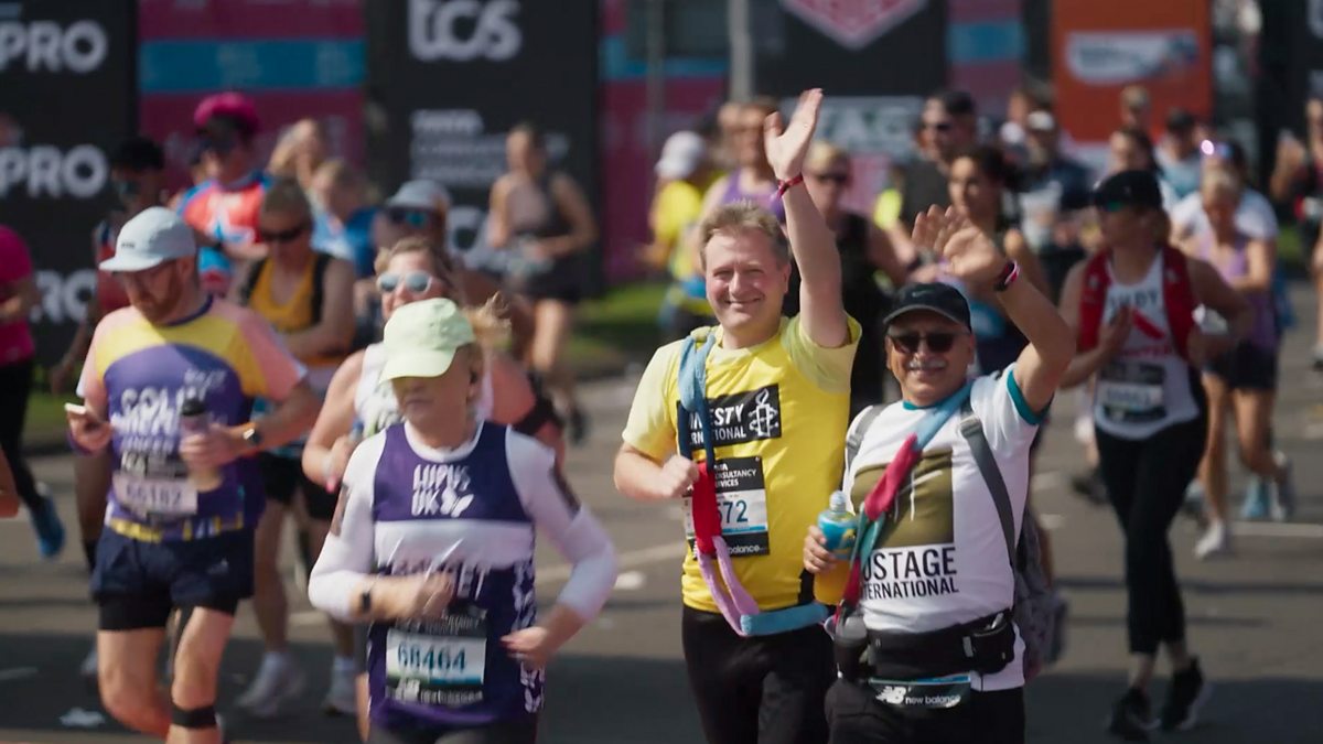 Richard Ratcliffe and Anoosheh Ashoori run the London Marathon. This will be Anoosheh's fourth time completing it, at the age of 71.
