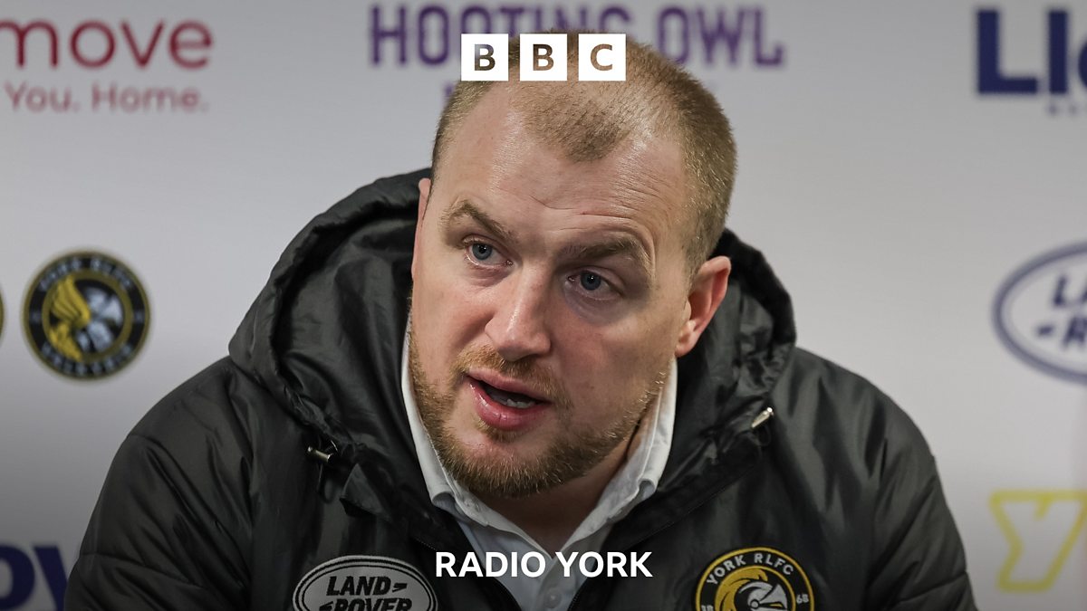 York Knights head coach Mark Applegarth speaking to Andy Atkinson, after their 56-10 win over Keighley Cougars