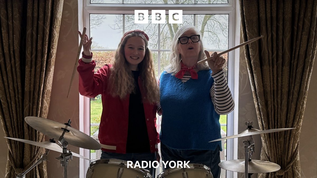 12-year-old Nancy from Scarborough teaches Georgey Spanswick some drumming skills.