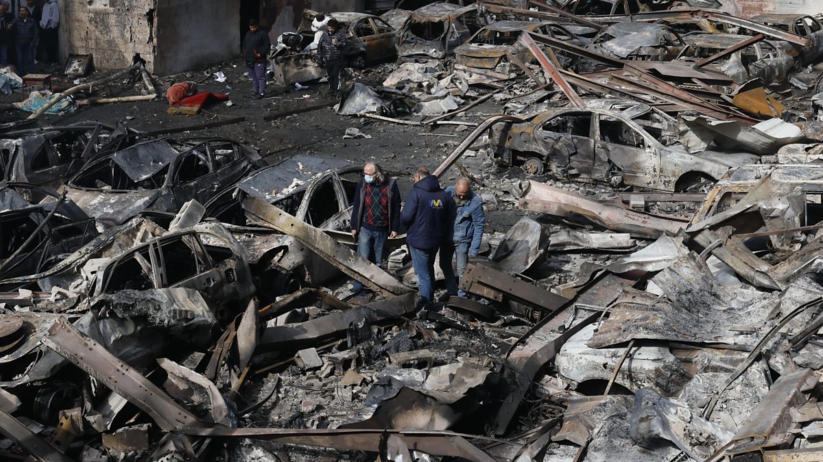 (Photo: People walk amongst the debris a building and cars destroyed in an Israeili airstrike in the Corniche el-Mazraa neighborhood of Beirut, Lebanon, 09 April 2026. Credit: WAEL HAMZEH/EPA)