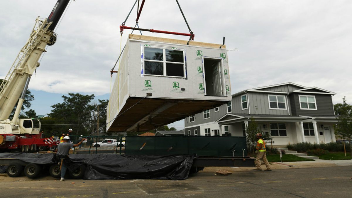 Picture description: A crane taking modular home segments and stacking them on one on top of the other to make a new duplex.