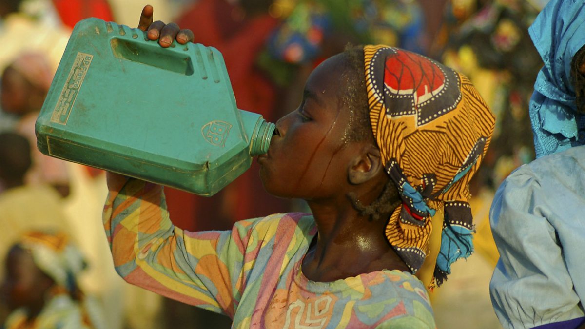 (Photo: Cameroonian Girl sweating and drinking water from a green jerry can. Credit: Getty Images)
