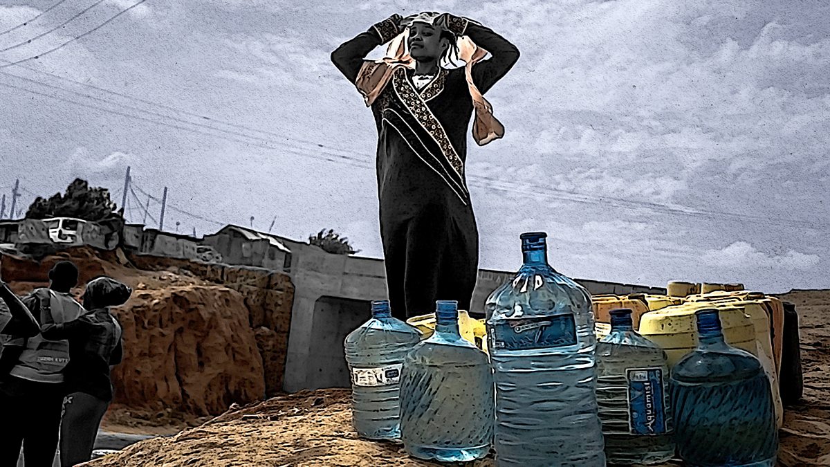 (Picture: A woman standing next to her water containers and bottles of water. Credit: Getty/BBC)