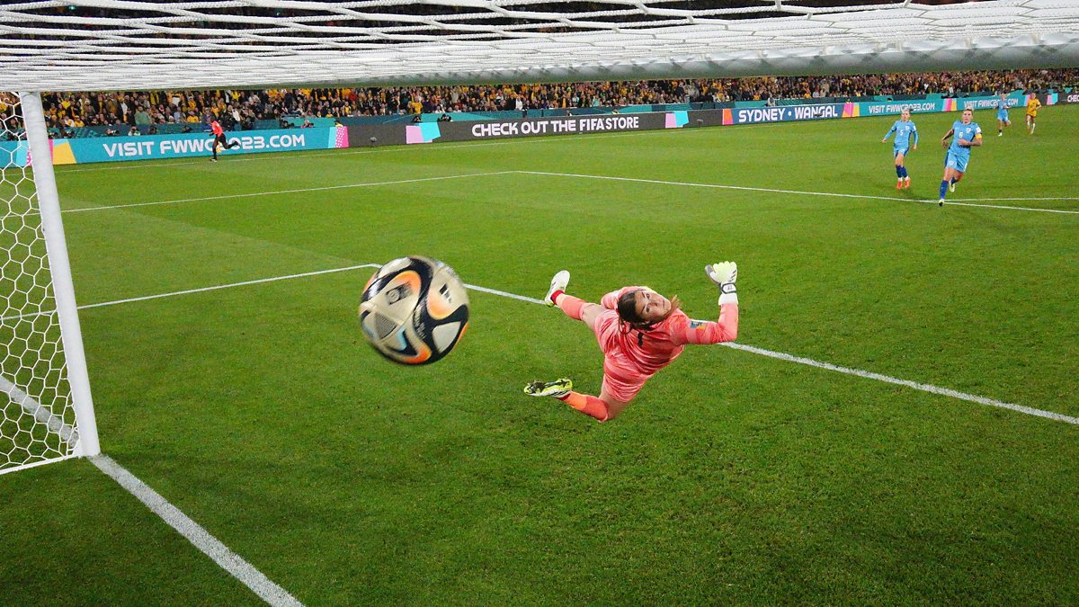 (Photo by Cameron Spencer/Getty Images: Goal picture from the World Cup semi-final match between Australia and England at Stadium Australia on August 16, 2023)