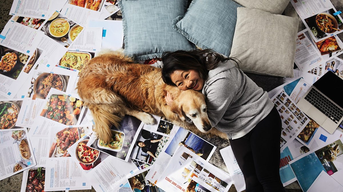 (Picture: Nagi Maehashi with her dog Dozer, surrounded by print-outs of her recipes. Credit: Rob Palmer)