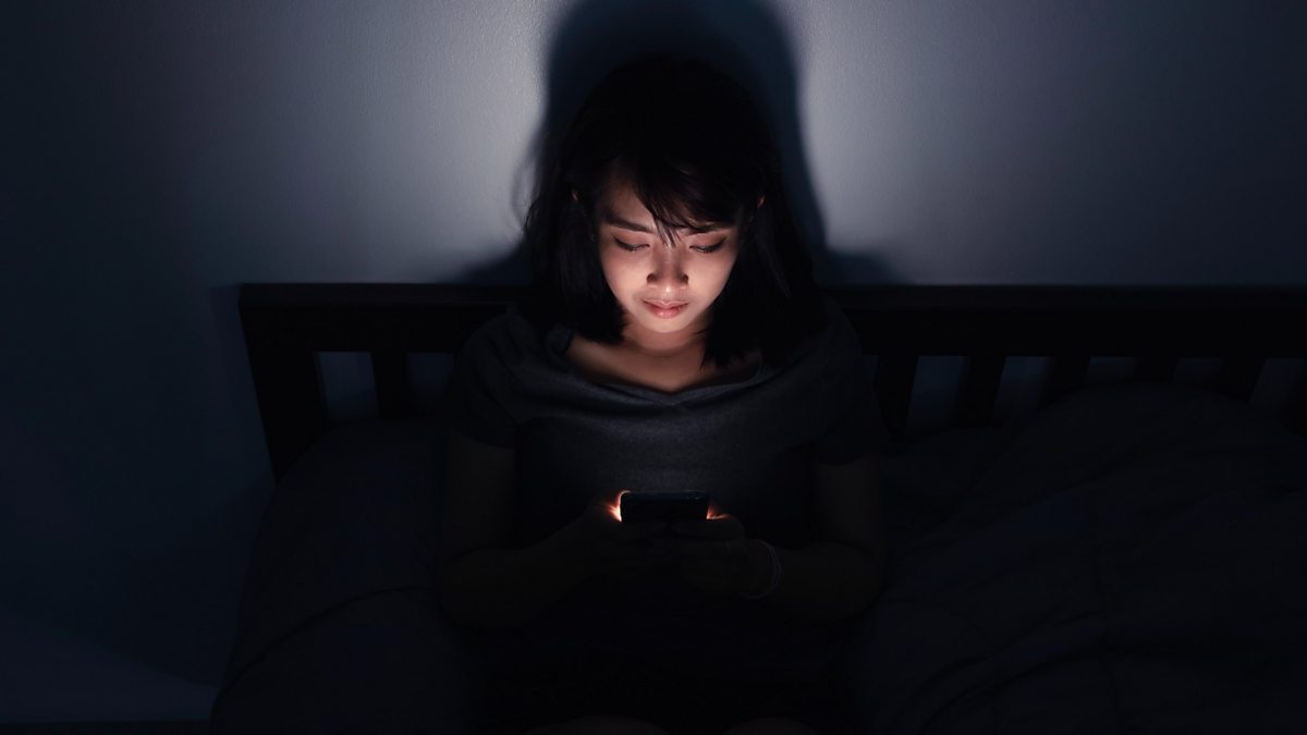 (Image: Woman looking at her phone in the dark. Credit: Getty Images)