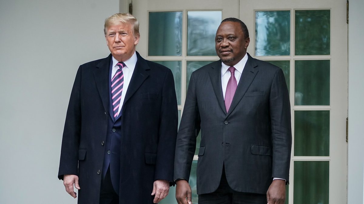 (Picture: Then President Donald Trump walks with the former Kenyan President Uhuru Kenyatta on the White House colonnade as they make their way to the Oval Office, on February 6, 2020 in Washington, DC. Credit: Getty Images)