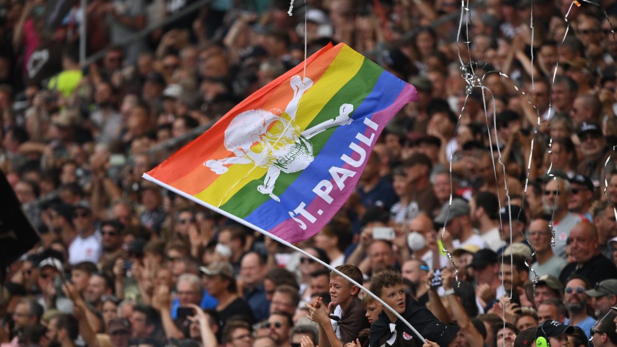 (Image: Fans of St.Pauli wave a skull and crossbones rainbow flag during the match between FC St. Pauli and 1. FC Magdeburg at Millerntor Stadium in Hamburg, Germany, 14 August 2022. Credit: Getty Images)