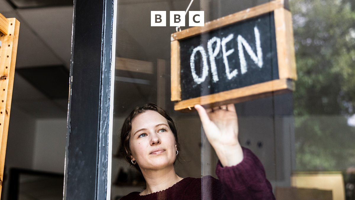 (Image: A shop owner holding an open sign. Credit: Getty Images)