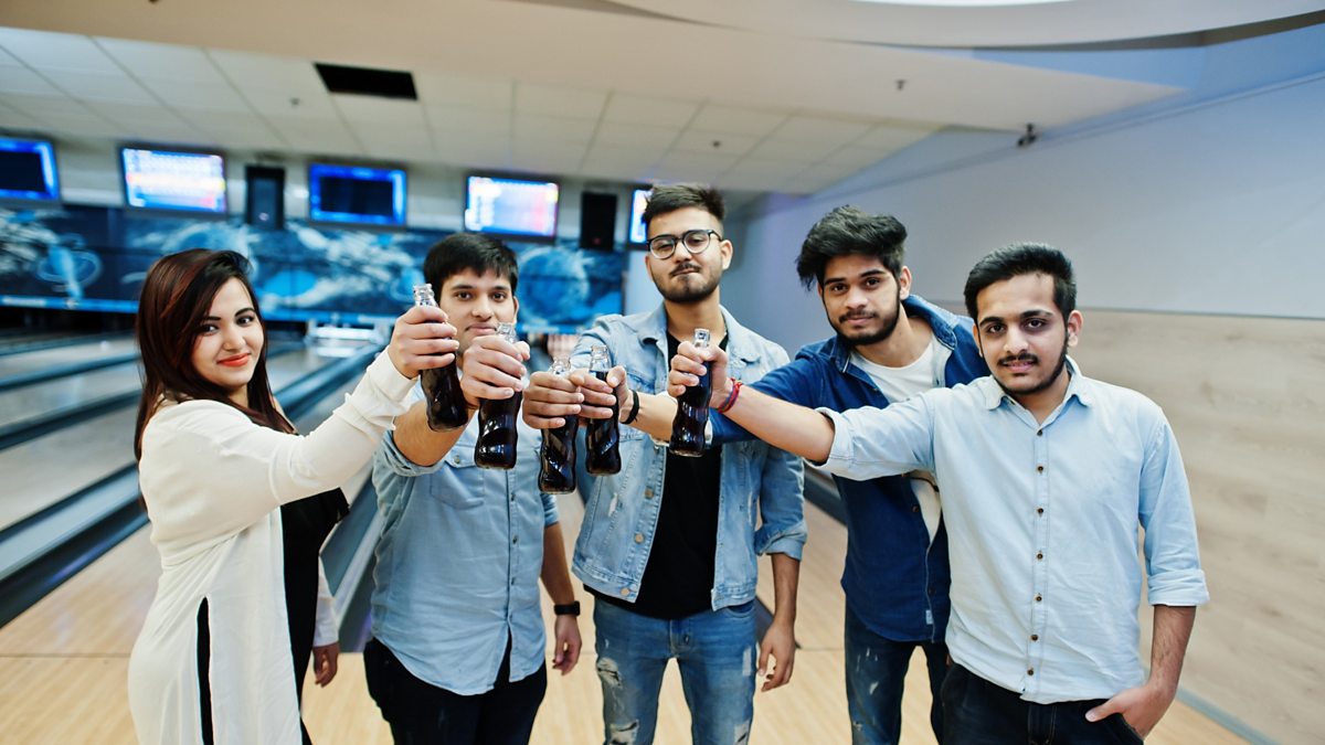 (Image: A group of young people drinking soft drinks at a bowling alley. Credit: Getty Images)