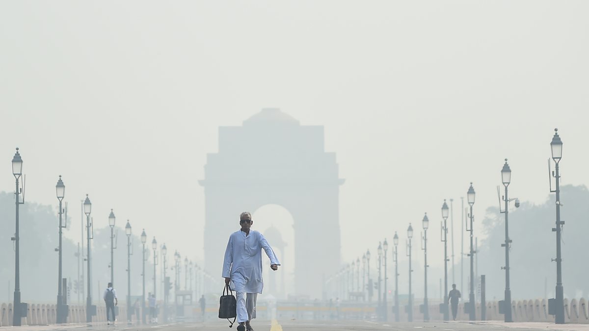 Image: A commuter walks near India Gate amid heavy smog pollution on October 29, 2025 in New Delhi, India. Delhi is once again blanketed by hazardous smog following the Diwali festival, as pollution levels spike to the "very poor" and "severe" categories, with air quality indexes far exceeding safe limits. The crisis, which is driven by firecracker use, emissions, and seasonal crop residue burning has prompted emergency measures like cloud seeding.