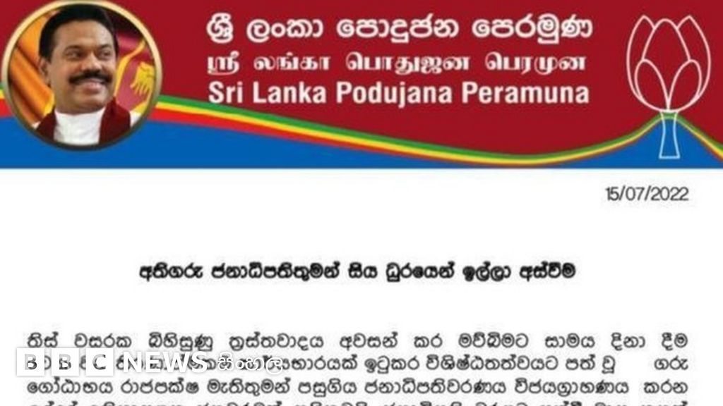 ජනාධිපති ගෝඨාභය රාජපක්ෂ ධුරයෙන් ඉල්ලා අස්වීම පිළිබඳ නිවේදනයක් නිකුත් කරමින් ශ්රී ලංකා පොදුජන පෙරමුණ මේබව කියා සිටියේය.