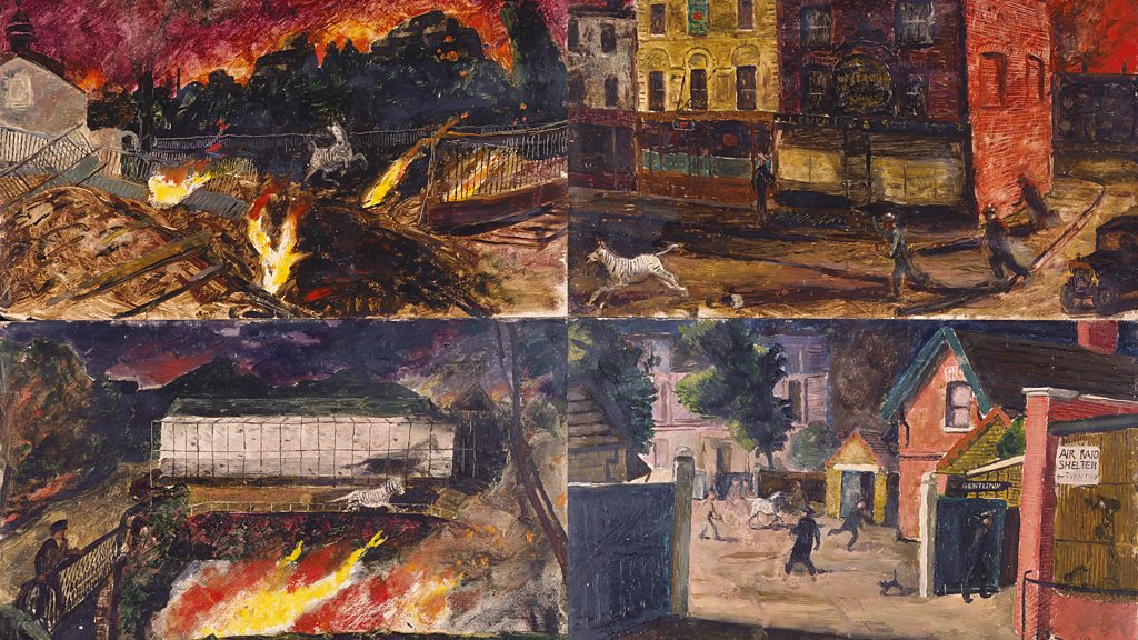 War is often described as a dehumanising process. But what happened to Britain’s non-human inhabitants in this terrible conflict? In a painting in Manchester City Art Gallery, a zebra rears up, black and white striking against the terrible night scene. The sky reddens in the distance from a vast explosion in 1940. War artist Carel Weight painted the zebra that galloped out of the zoo in to the maddened city. The animal escaped unscathed, but thousands of animals didn't. Four panels show the journey of the terrified zebra and close on his hooves are sketchy figures, trying to capture the fleeing animal. One of them may have been a keeper at London Zoo at the time, called Shelley. In this feature, it's an imaginary Shelley who tells us what happened, recalling the night the Zebra House was bombed, along with the goings-on at city zoos during World War Two. Between archive footage, the rumble and shock of explosions, the voices of non-human creatures and of human historians, we hear how animals in zoos fared, along with the terrible fate of 400,000 cats and dogs, killed in September 1939, on the orders of their anxious owners who feared the onslaught of war. It was at London Zoo that Julian Huxley, then Secretary of the Zoological Society, would try and spare the animals the sounds of bombing and sirens drowning out the destruction with gramophones playing the music of Sibelius. Animals were central to the way Churchill imagined the conflict. Visiting London Zoo in 1939, as war loomed ever closer, Churchill learned that the zookeepers were primed to shoot top predators: the lions and tigers if they escaped. As recorded by Huxley in his memoirs, Churchill replied ‘What a pity!’ before staring into the middle distance and conjuring for him an extraordinary and disturbing apocalyptic fantasy. Churchill’s vision was a London of fire, burning wreckage, the noises of war, and big cats roaming the bombed out streets in search of dead bodies. Peter Markinker is the voice of Shelley. Contributors include the historians Marianne Sommer, Richard Sam Deese, Hilda Keane and Andy Flack; Archivist Sarah Broadhurst and Curator Hannah Williamson. Devised by David Barnes and produced by Kate Bland A Cast Iron Radio Production for BBC Radio 3.
