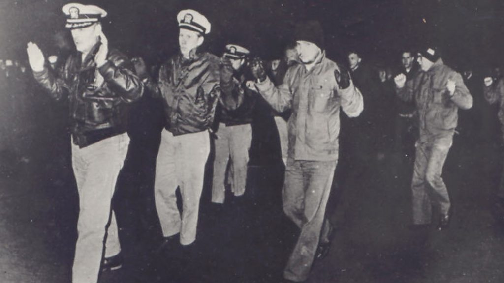 In January 1968 an American spy ship was captured by North Korean forces. Its crew were held for almost a year but they found small ways to resist. Hear from one of the US sailors on board. Photo of the Pueblo's crew taken by North Korean military.