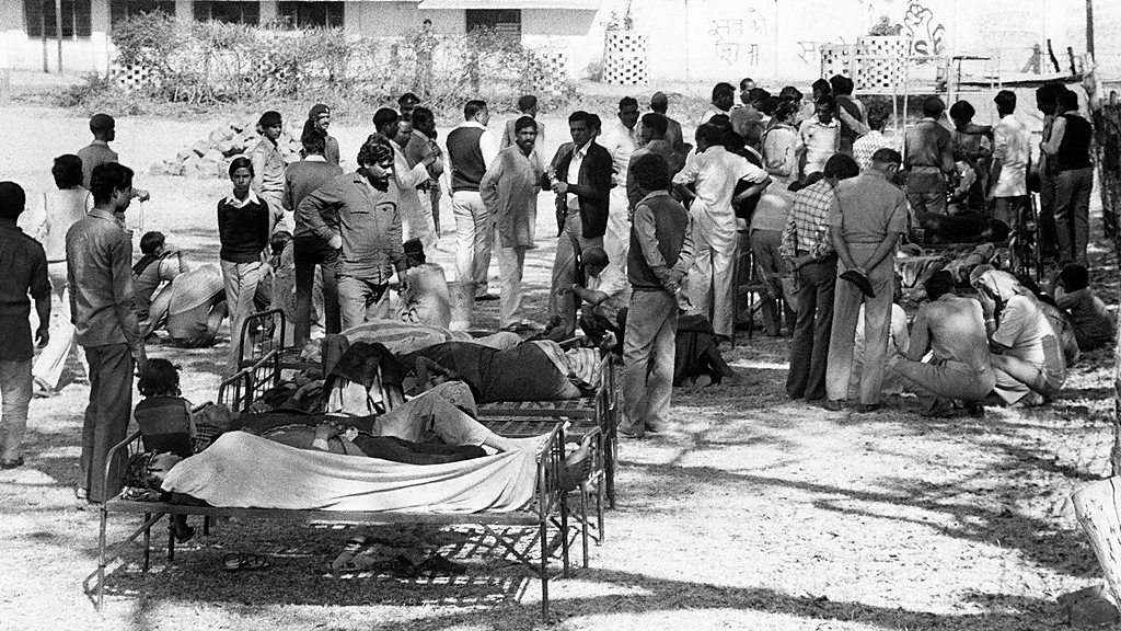 In December 1984 thousands of people in the Indian city of Bhopal were killed by leak from a chemical plant. The city was enveloped by a cloud of poisonous gas. Two survivors of the disaster have spoken to Witness. Photo:Waiting for treatment outside the hospital. Copyright: Bedi/AFP/Getty Images