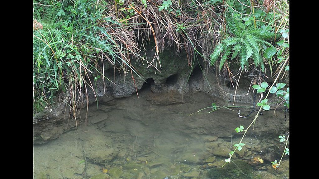 Trafodaeth am lun a anfonwyd i'r rhaglen gan Alun Jones o dyllau ar lan afon