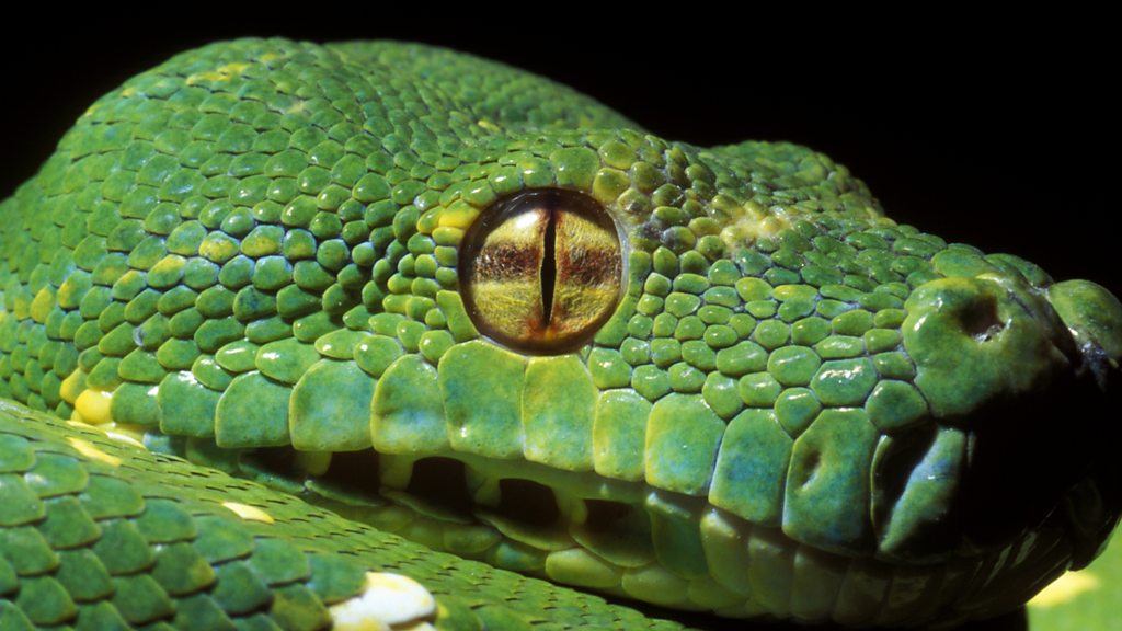 The mythology and biology of the snake. "The cobra is shown on the brow of the king, rearing up with the whole throat swollen, the dramatic gesture we call the uraeus." Picture: Green tree python, Credit: Getty Images