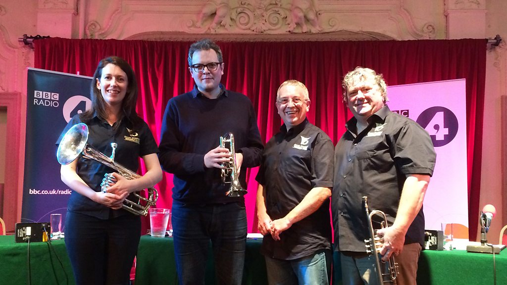 Miles introduces members of James Shepherd Versatile Brass for a performance of the News Quiz theme tune they recorded in 1974