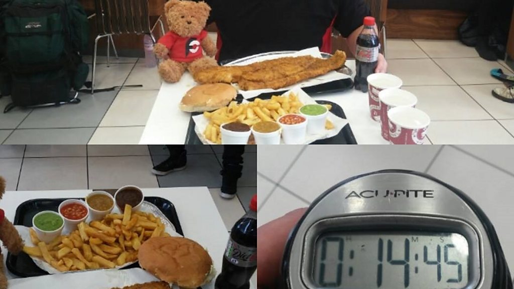 An American professional eater is currently eating his way around Wales. In Wrexham, Randy Santel from St. Louis in Missouri, took on Mother Hubbard's fish and chip challenge - a 32 ounce fish, a 15 ounce portion of chips with sauce, mushy peas and half a litre of fizzy drinks -- which he demolished in under 15 minutes! He explains how and why he completes eating challenges for a living.