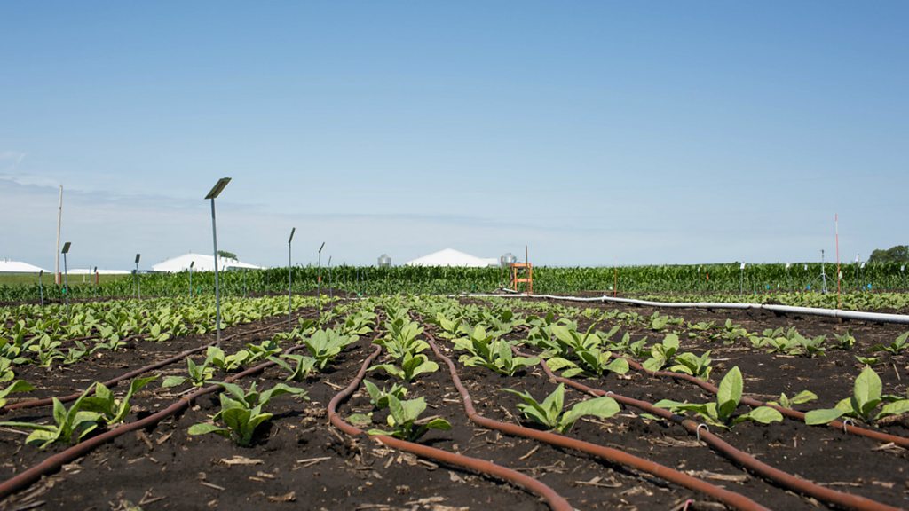 Scientists involved in a trial on tobacco plants say they have improved "the most important biological process on the planet" - photosynthesis. The breakthrough could boost crop yields and help meet the global demand for food, as lead researcher Professor Stephen Long, from the University of Illinios, explains. (Photo: Irrigation lines snaking through photoprotection field trials at the University of Illinois South Farms. Credit: Associated Press /University of Illinois)