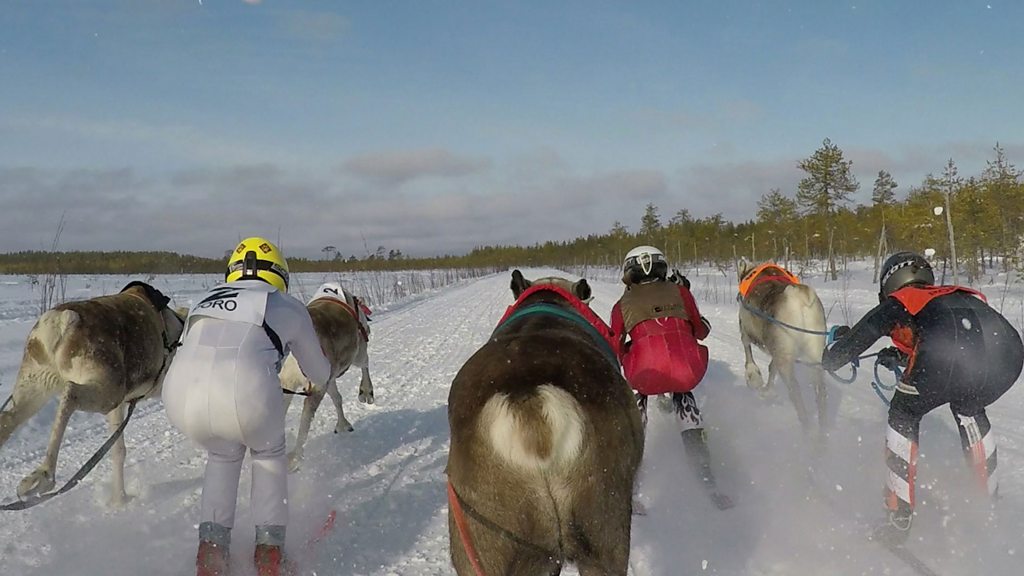 Competitive reindeer-racing is a popular sport across the Arctic Circle. In Finland, the season runs from November to April and good jockeys are local celebrities. They need strong biceps and serious guts: strapped onto cross-country skis they're hauled behind reindeer at up to 60km/hour. Meanwhile, the animals are trained to peak fitness. Owners give their reindeer massages and whisper last minute instructions in their ears. Cathy FitzGerald travels to the snowy north of Finland to find out more about the sport. She visits the little town of Inari, where the cappuccinos come with tiny antlers sketched in the foam and the local bar (PaPaNa, ‘The Reindeer Dropping’) serves pizza topped with bear salami. Each year, the top 24 fastest reindeer compete here to be crowned: The Reindeer King. They fly around a two-kilometre race track carved on the surface of icy Lake Inari to the cheers of hundreds of spectators. There’s a social side to the competition, of course: a winter village grows up around the track, where herders can browse for cow-bells, snow-mobiles and fox-fur hats. And at night, there’s dancing under the northern lights at Hotel Kultahovi, where Eero Magga croons his big hit, ‘Poromiehen Suudelma’ – ‘The Reindeer Herder’s Kiss’ – to an appreciative reindeer-racing crowd. Picture: Competitors and their reindeer set off across the snow, Credit: Kirsten Foster